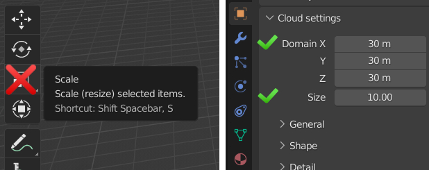 Warning: do not scale de cloud object with the scale gizmo, instead use the size parameter to scale the cloud or the domain property: